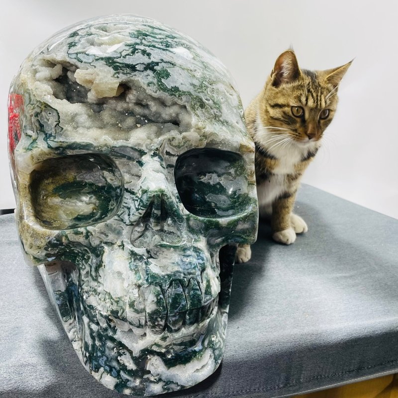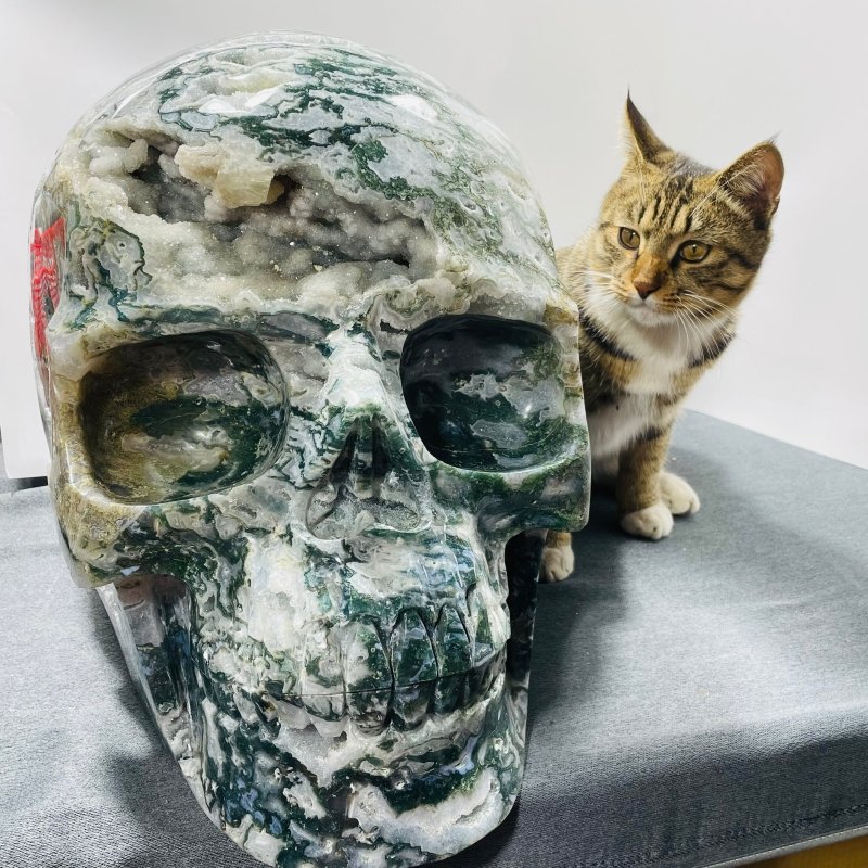 71.8kg Very Large Geode Druzy Moss Agate Skull Carving 20Inch | Australia