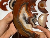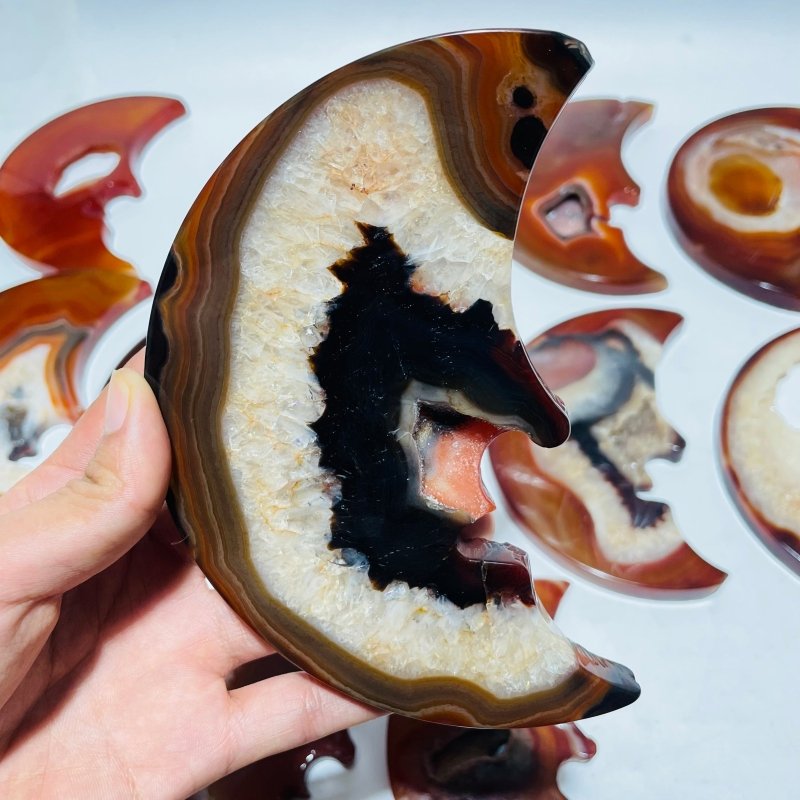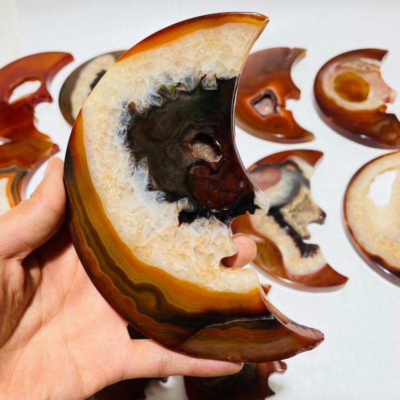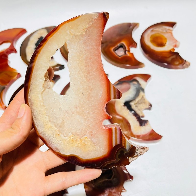 We sell our large carnelian moon face carving in lots that are 12pcs,you will get the same of stones as in the photo and video.